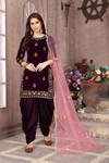 Burgundi indiai salwar kameez bársonyban, hímzéssel