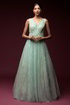 Bellissimo vestito verde in chiffon, con maniche lunghe, decorato con ricami in filo di seta ritorto con lurex e perline