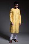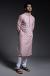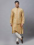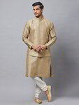 Червоний шовковий чоловічий френч (комір — стійка) з вишивкою і пісочні штани
